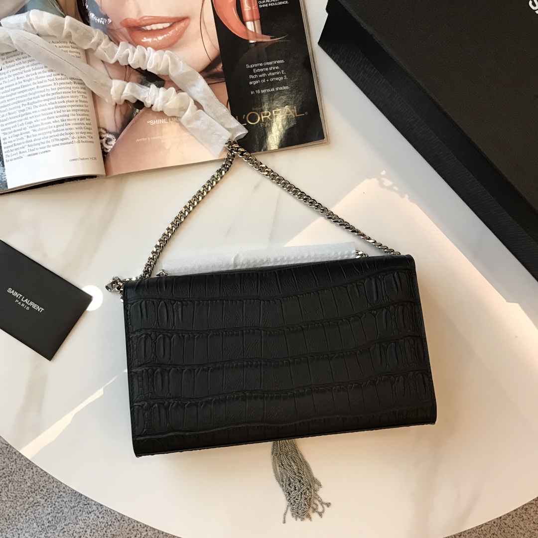 YSL 圣罗兰 原单 哑光 鳄鱼纹 流苏包 377829 对版五金 24cm 黑色