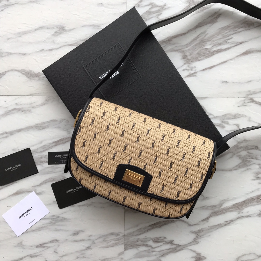 YSL 最新款 马鞍包采用圆形翻盖,布满 YSL 压花图案,真皮衬里镌刻标志磁扣封口一个拉链内袋一个插袋配以可调式真皮肩带尺寸23cm编码585006