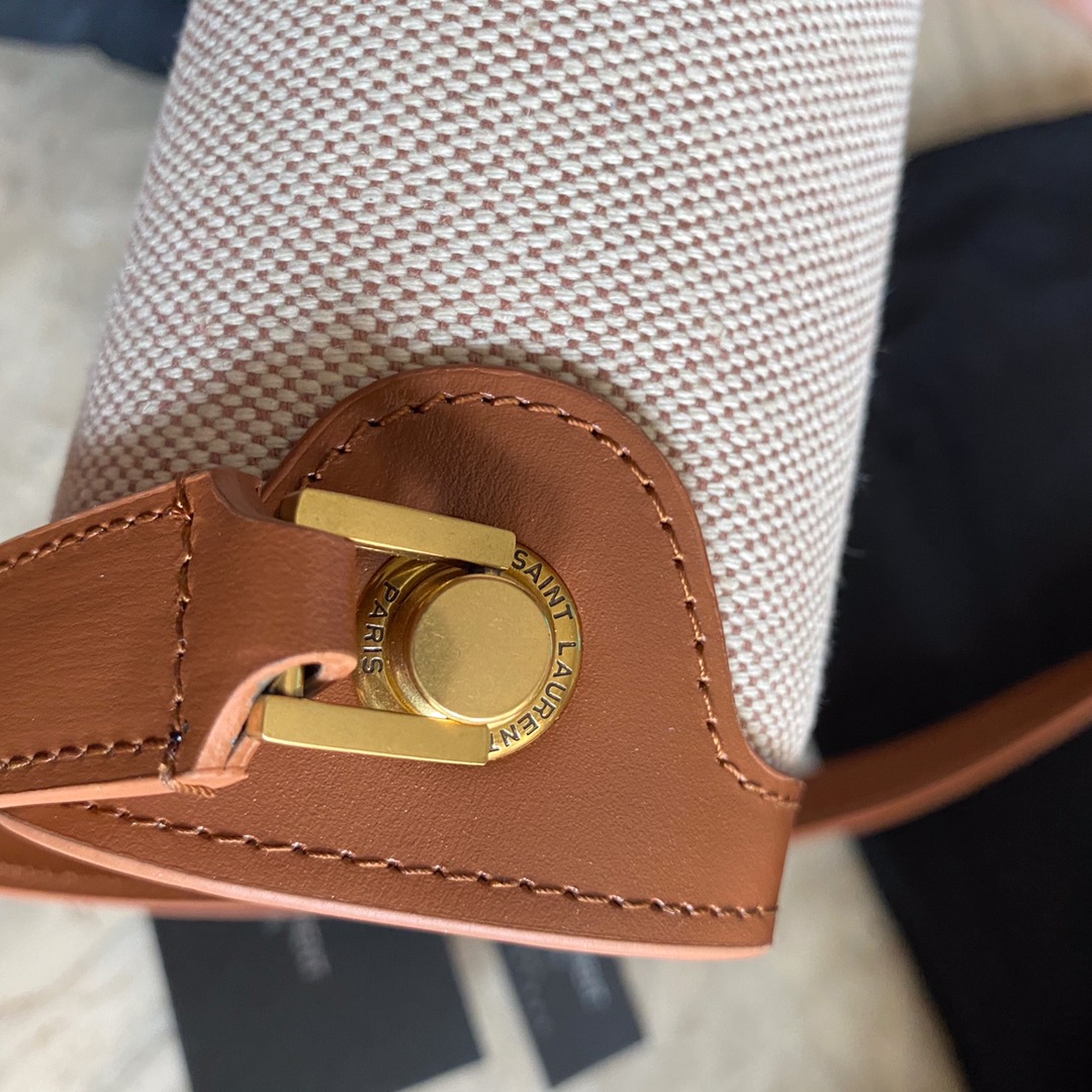 SAINT LAURENT 最新款 “Carre” 单肩包样式方正且隽永实搭,全新的撞色 浅色的是麻布,棕色的是头层牛皮 能伴你长久,值得投资。单品设计灵感源自复古的学院包,正面设有刻着 Logo 的金属配件,包内则置有拉链与带盖口袋,推扣式正面翻盖 。尺寸23×17.5×6.5 编码512852